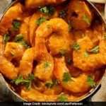 Grote garnalen met milde curry, kokos, kookroom, rozijnen en amandelen