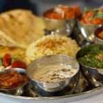 Vega Samosa, Saag Gucchi, Daal Special, naan, salade, rijst, zoete yoghurt
