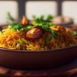 Rijstschotel met geroosterde lam en Indiase kruiden